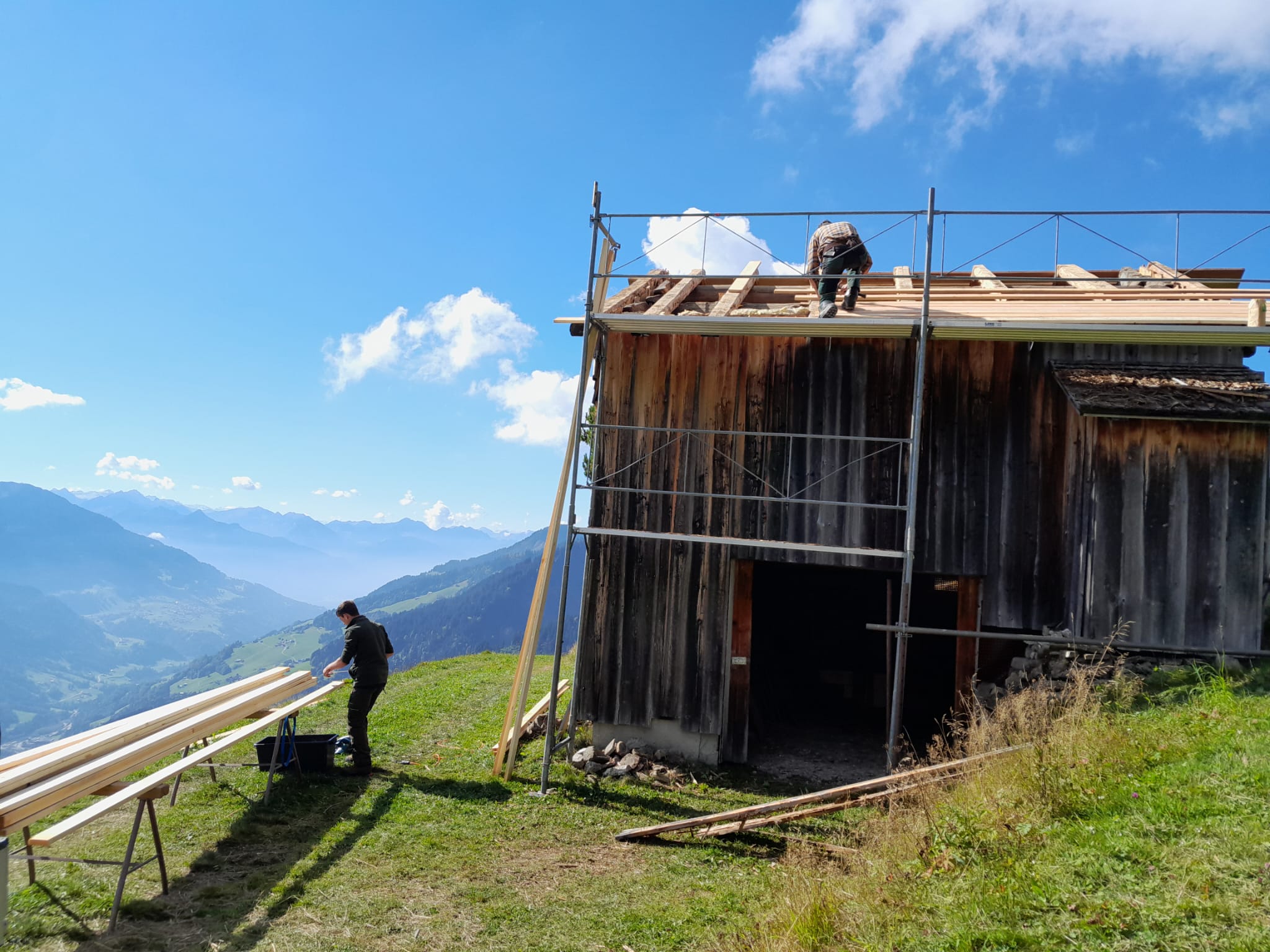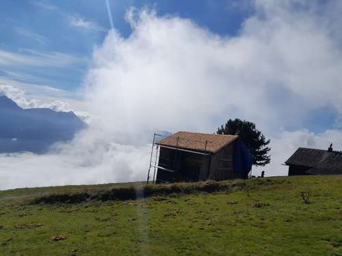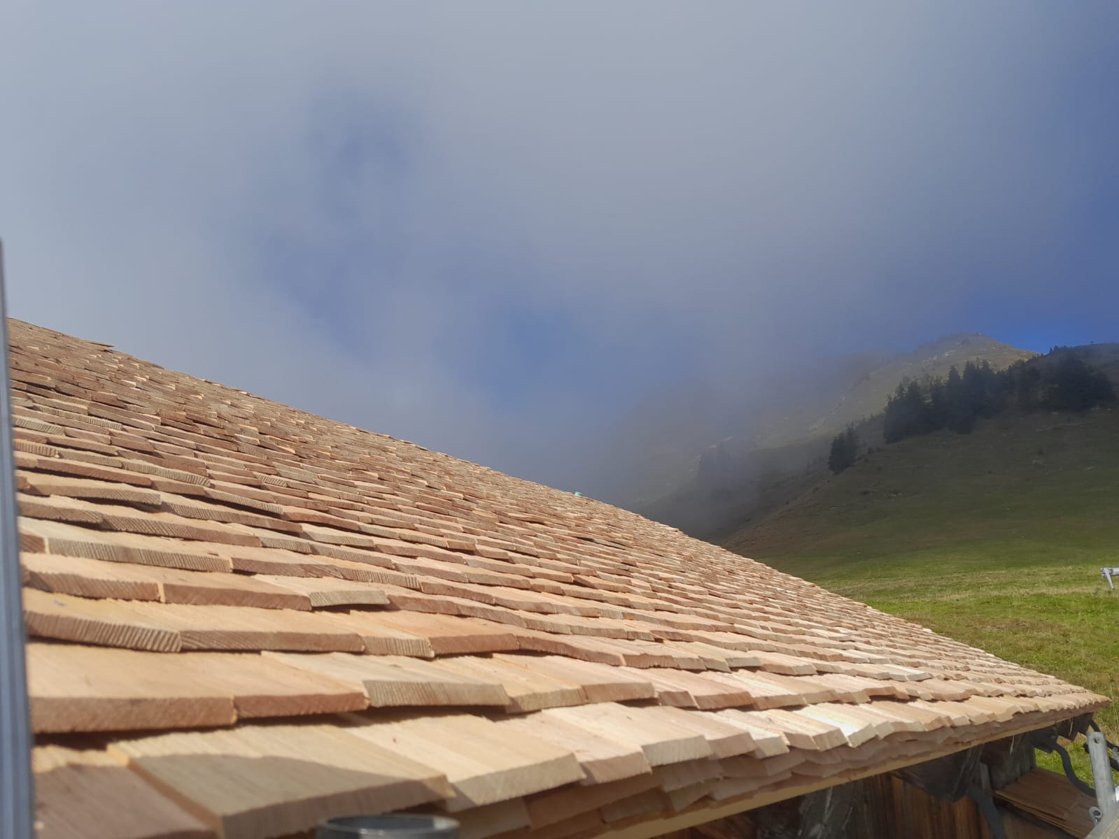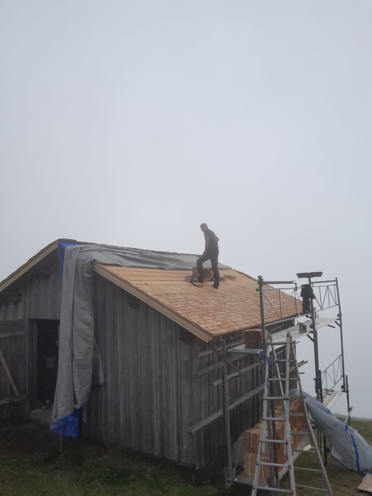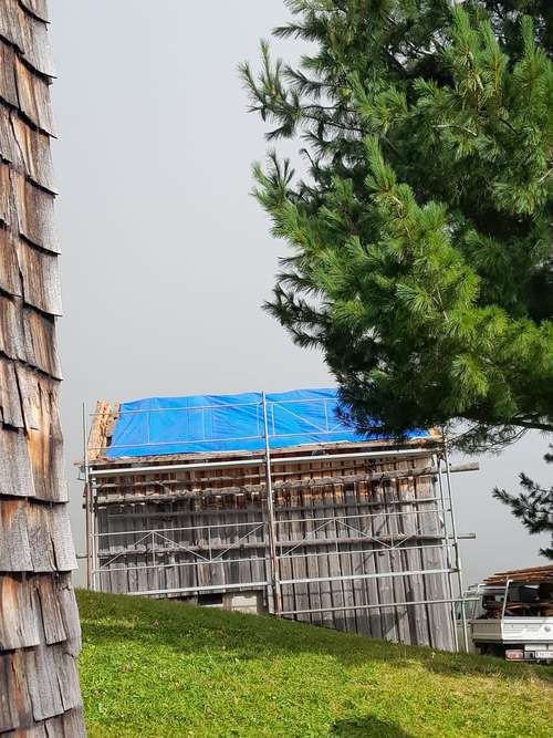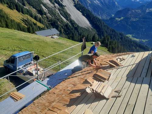 Zwischenzeitlich haben wir mit Hilfe der Firma Dachdecker Lins den kleinen Stall auf der Alpe Bäri - Maisäß Zafern mit Lärchenschindeln neu eingedeckt. Nochmals vielen Dank an die Firma Lins, da dies als ein kostengünstiges Lehrlingsprojekt abgewickelt wurde.